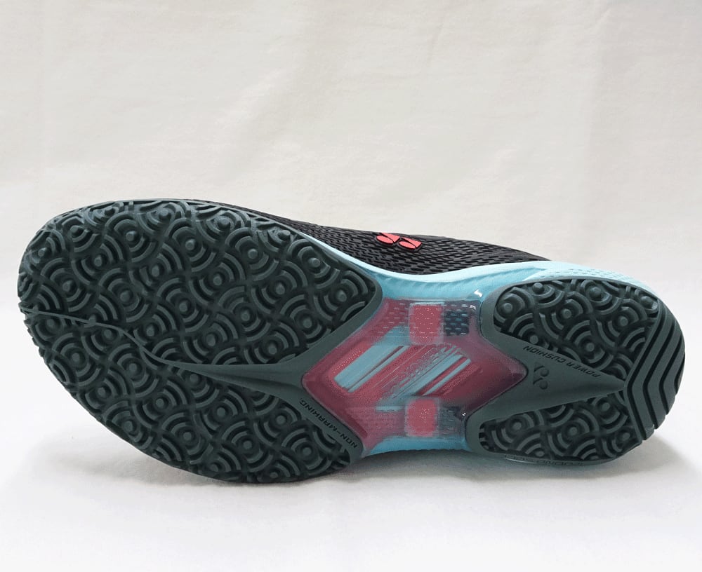 ソールにカーボンプレート内蔵、新形状シャンクと反り上げたつま先形状が生み出す瞬発力で素早くコートを駆け巡る。クレー・オムニコート用、幅広モデル。