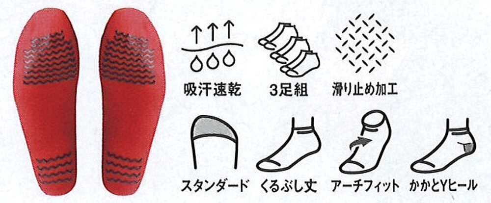 部活動の練習などに、吸・透湿性を考慮した3足組、ノンスリップ加工、くるぶし丈、土踏まずアーチフィット、かかとYヒール設計。